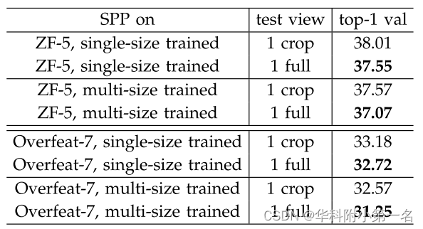 接下来我们研究全图像视图的准确性。在保持纵横比不变的情况下,我们将图像缩放到min(w,h)=256。SPP-net应用于整张图像上以计算全视角的得分。为了公平比较,我们也计算了在中心进行224*224裁切的单一视图(上述评估都用过)的准确性。单视图比较的准确性如表3所示。我们在ZF-5/Overfeat-7进行了验证。在全视图表示中top-1错误率全部下降。这说明保持完整内容的重要性。即使网络训练时只使用了正方形图像,网络却也可以很好地适应其他的比例。