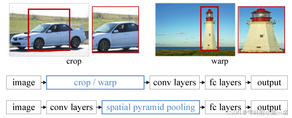 然而,在CNN的训练和测试都存在一个技术问题:这些流行的CNNs都需要输入的图像尺寸是固定的(比如224×224),这限制了输入图像的长宽比和缩放尺度。在应用于任意尺寸的图像时,当前的方法倾向于通过裁剪或形变先将图像缩放到固定尺寸,如图1(上)所示。但裁剪的区域不包含整个目标,而形变会导致不必要的几何失真。由于内容丢失或失真,识别精度可能会受到影响。此外,当目标比例变化时,预定义的比例可能会不适合。修复输入图像的大小会忽略比例的问题。