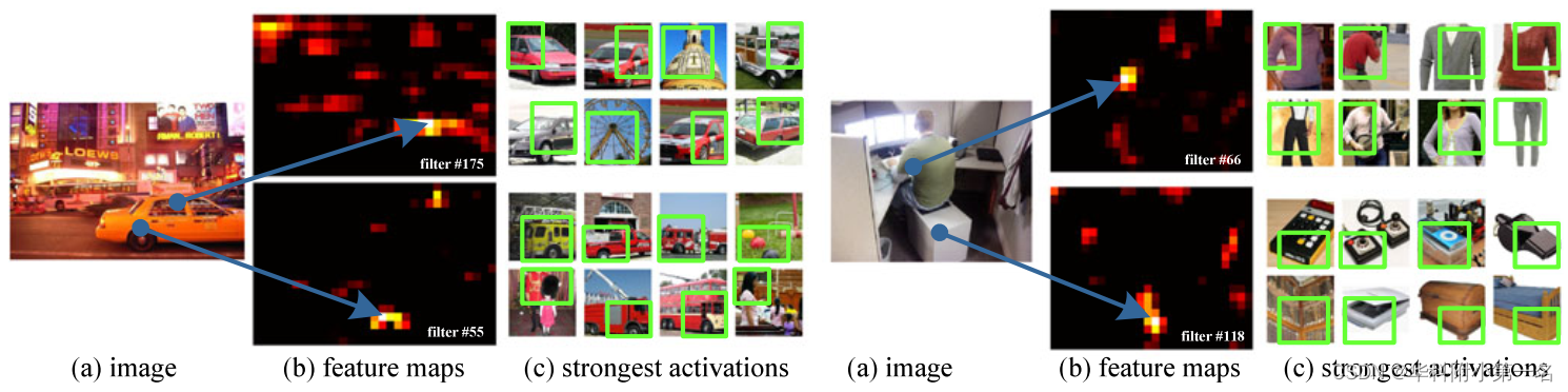 图2.特征图的可视化。(a) Pascal VOC 2007中的两张图像。(b) conv5中一些卷积核的特征图。箭头表示最强的响应及其在图像中的相应位置。(c) 相应卷积核具有最强响应的 ImageNet图像。绿色矩形标记最强反应的感受野。