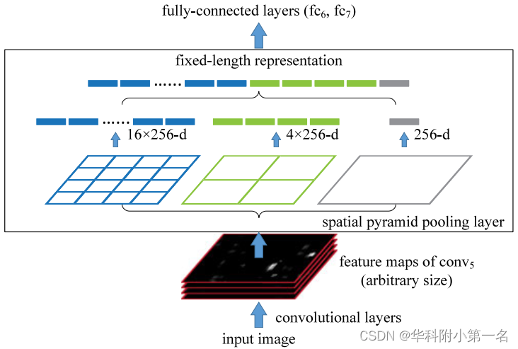 图3.具有空间金字塔池化层的网络结构。这里256是conv5层的卷积核个数,conv5是最后一个卷积层。
