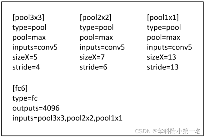 图 4. cuda-convnet方式的三级金字塔池示例。sizeX表示池化窗口的大小。此配置适用于 conv5 的特征图大小为13*13的网络,因此pool3*3、pool2*2 和 pool1*1层将分别有3 * 3、2*2和1*1个块。