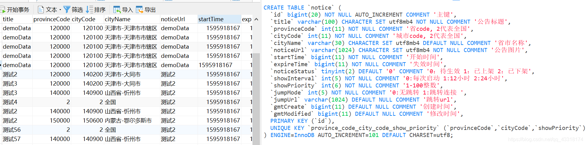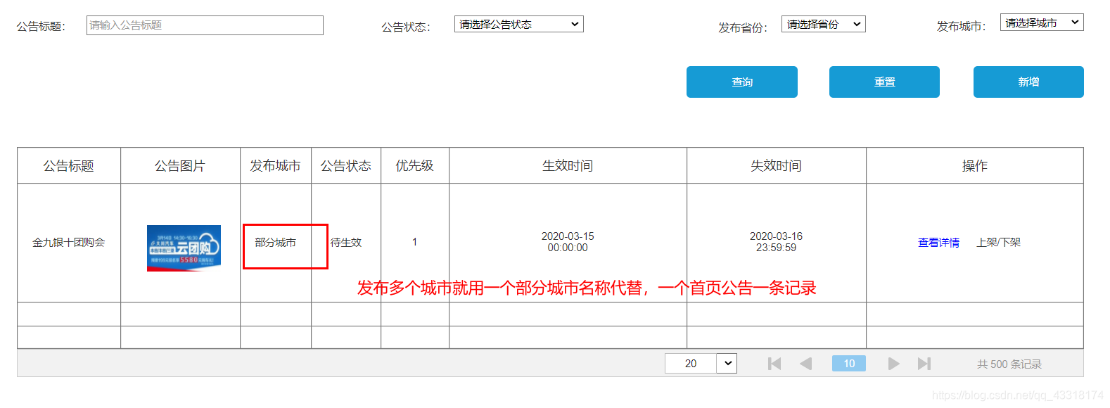后台的首页公告,一个首页公告可以发布好几个城市,按理来说,存一个首页公告时有一个字段要存下所有的发布城市,那么这个首页公告就在数据库里只有一条记录就行了,但是实际上存的是一个城市一条记录,那么就是比如说我一个首页公告发布了2个城市,那么现在存库的时候库里就有两条记录,除了发布城市的cityCode码不同外,其他首页公告的属性信息比如说名称,跳转链接和是否生效以及公告图片都相同,但是实际在分页查询的时候是一个首页公告名称只显示一条记录,那些多个的发布城市已经被一个字段给代替了