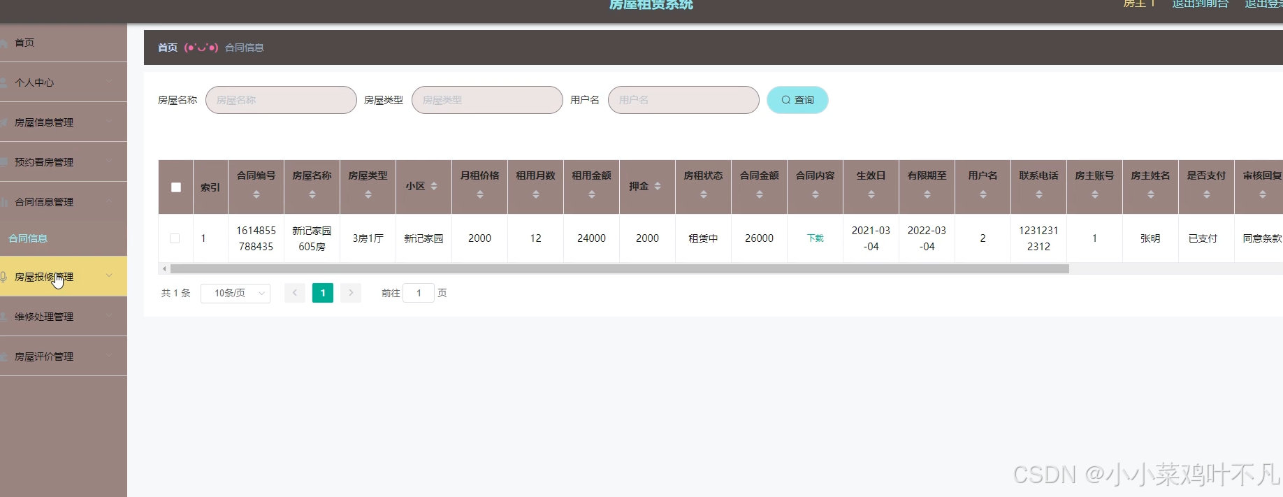 通过用户后台系统可以进行个人中心、预约看房管理、合同信息管理、房屋报修管理、维修处理管理、房屋评价管理、我要当房主管理和我的收藏管理等功能模块,进行相对应操作。