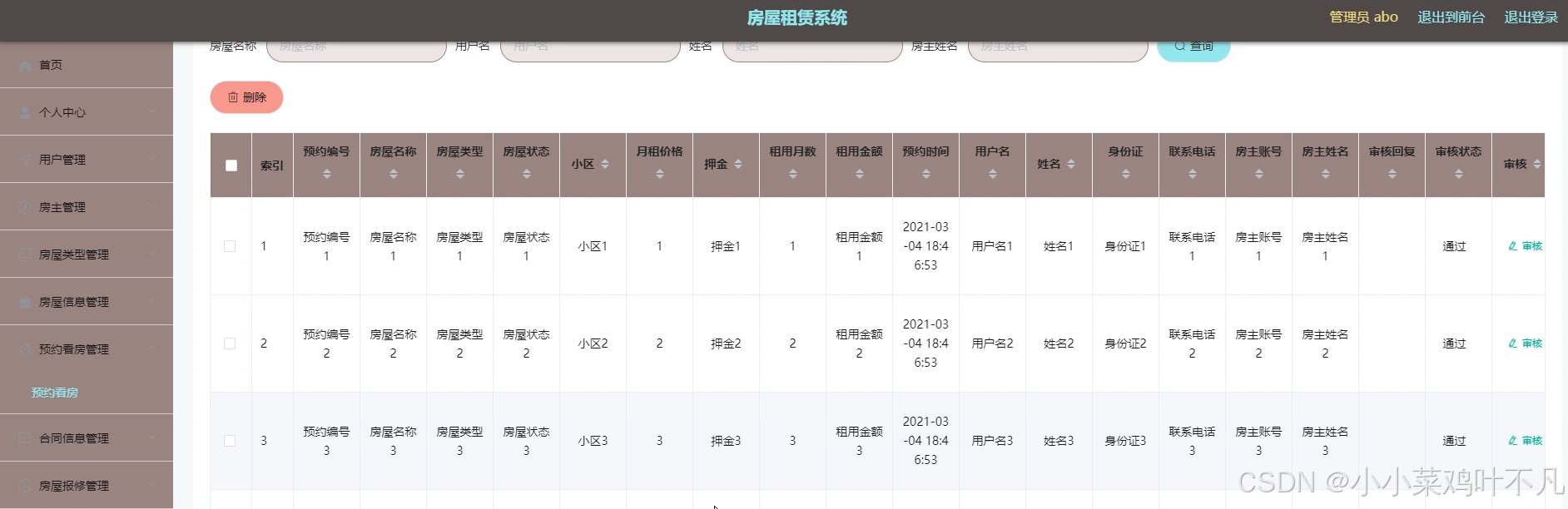 预约看房管理:通过列表可以获取预约编号、房屋名称、房屋类型、房屋状态、小区、月租价格、押金、租用月数、预约时间、用户名、姓名、身份证、联系电话、房主账号、房主姓名、审核回复、审核状态等信息,进行审核或删除操作,如图5-6所示。