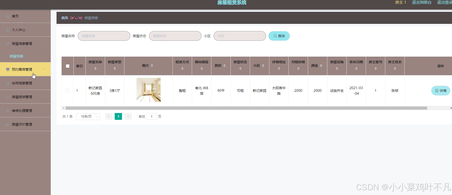 预约看房管理:通过列表可以获取预约编号、房屋名称、房屋类型、房屋状态、房屋状态、小区、月租价格、押金、租用月数、租用金额、预约时间、用户名、姓名、身份证、联系电话、房主账号、房主姓名、审核回复、审核状态等信息、进行查看详情信息操作,如图5-10所示。