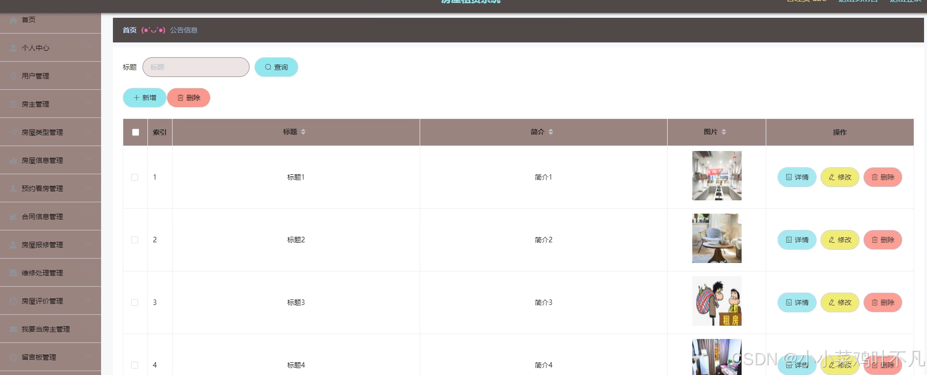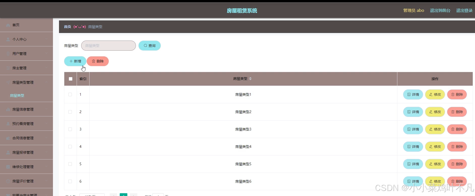 房屋类型管理:通过列表可以进行查看房屋类型,进行查看详情或修改、删除操作,并通过新增进行添加类型信息,如图5-3所示。