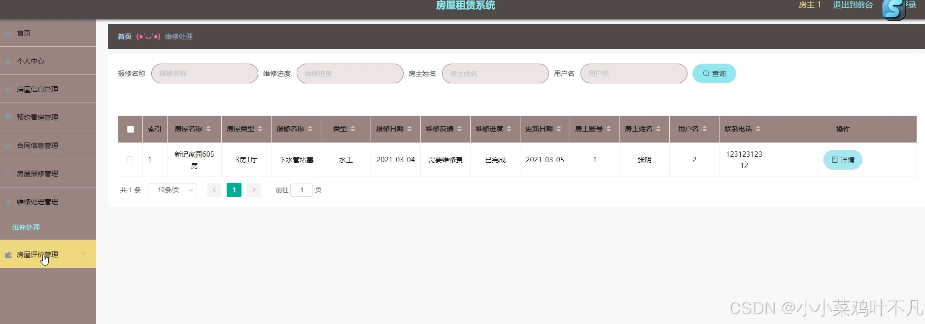 维修处理管理:通过列表可以进行查看房屋名称、房屋类型、报修名称、类型、报修日期、维修日期、维修反馈、维修进度、更新日期、房主账号、房主姓名、用户名、联系电话等信息,进行查看详细信息操作,如图5-12所示。