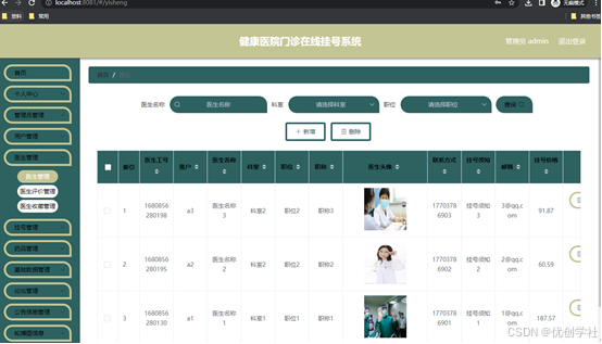如图5.3显示的就是医生信息管理页面,此页面提供给管理员的功能有:根据医生信息进行条件查询,还可以对医生信息进行新增、修改、查询操作等等。