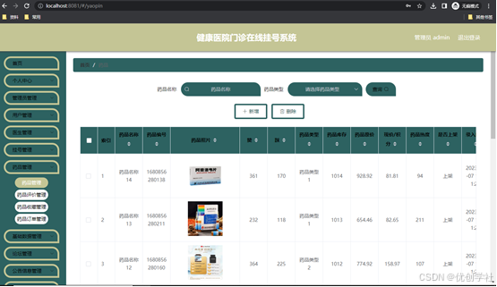 如图5.2显示的就是药品信息管理页面,此页面提供给管理员的功能有:查看已发布的药品信息数据,修改药品信息,药品信息作废,即可删除,还进行了对药品信息名称的模糊查询 药品信息信息的类型查询等等一些条件。