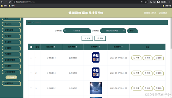 如图5.4显示的就是公告信息管理页面,此页面提供给管理员的功能有:根据公告信息进行新增、修改、查询操作等等。