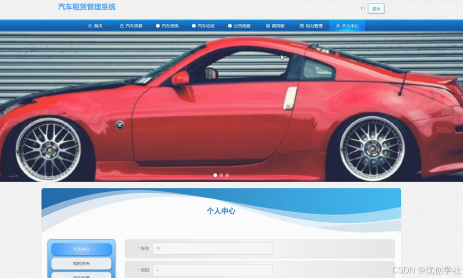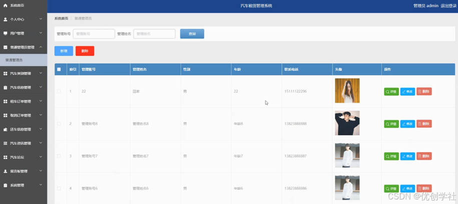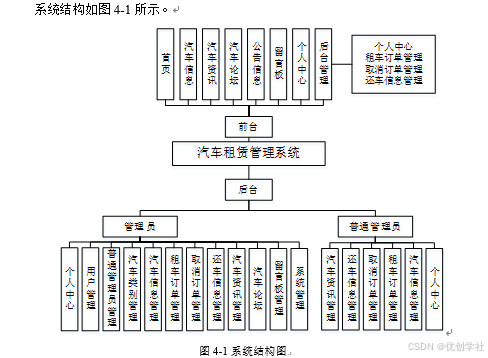 The topic is mainly divided into three modules: administrator module, user module and general administrator module. The main functions include: personal information modification, user management, general administrator management, automobile category management, automobile information management, car rental order management, order cancellation management, car return information management, automobile information management, automobile forum, message board management, system management, etc.