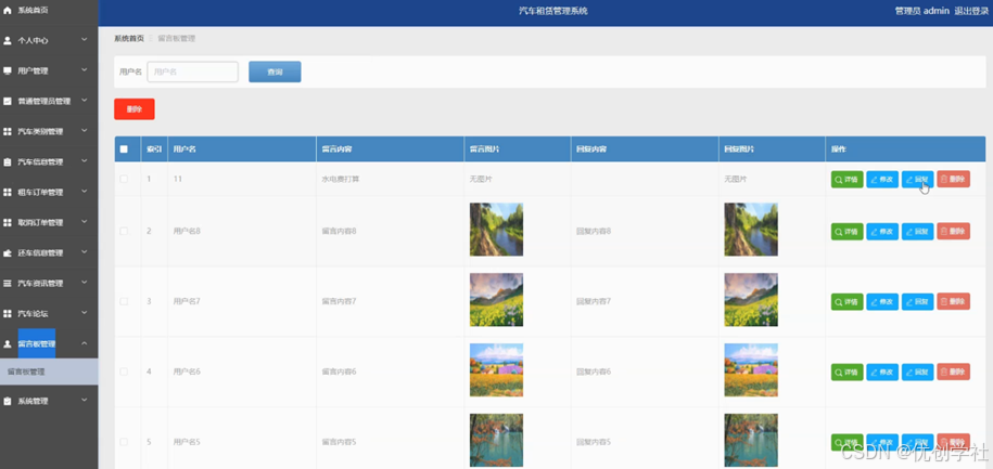 管理员点击留言板管理。进入留言板管理页面输入用户名可以查询或删除留言板列表,并根据需要对留言板进行查看详情,修改,回复或删除操作。如图5-12所示: