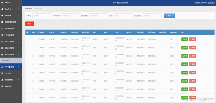 管理员点击还车信息管理。进入还车信息页面输入车牌号、车辆品牌、汽车类别、姓名和选择是否通过可以查询或删除还车信息列表,并根据需要对还车信息进行查看详情或删除操作。如图5-11所示: