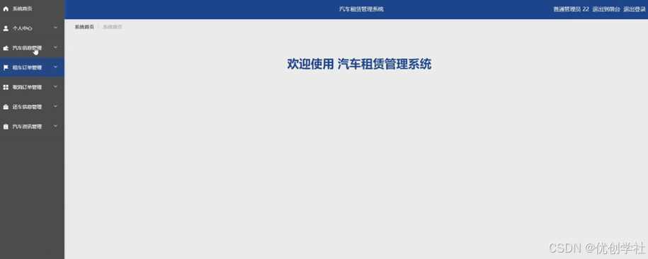 普通管理员进入主页面,主要功能包括对系统首页、个人中心、汽车信息管理、租车订单管理、取消订单管理、还车信息管理、汽车资讯管理等进行操作。普通管理员主界面如图5-17所示: