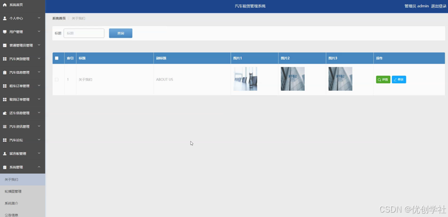 管理员点击系统管理,进入关于我们页面输入标题可以查询关于我们列表,并根据需要对关于我们进行查看详情或修改操作;还可以对轮播图管理,系统简介和公告信息进行详细操作。如图5-14所示: