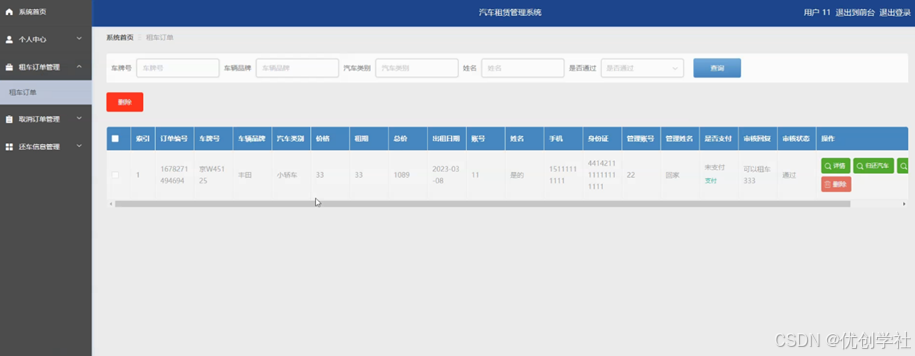 用户点击租车订单管理。进入租车订单页面输入车牌号、车辆品牌、汽车类别、姓名和选择是否通过可以查询或删除租车订单列表,并根据需要对租车订单进行查看详情,归还汽车,取消订单或删除操作。如图5-16所示: