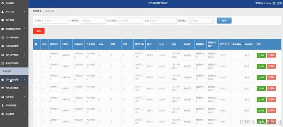 管理员点击取消订单管理。进入取消订单页面输入车牌号、车辆品牌、汽车类别、姓名和选择是否通过可以查询或删除取消订单列表,并根据需要对取消订单信息进行查看详情或删除操作。如图5-10所示: