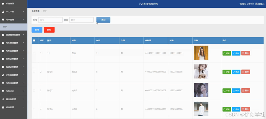 管理员点击用户管理。进入用户页面输入账号和姓名可以查询,新增或删除用户列表,并根据需要对用户信息进行查看详情,修改或删除操作。如图5-7所示: