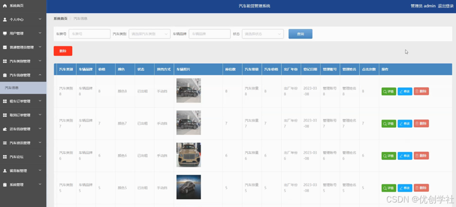 管理员点击汽车信息管理。进入汽车信息页面输入车牌号、选择汽车类别、车辆品牌和选择状态可以查询或删除汽车信息列表,并根据需要对汽车信息进行查看详情、修改或删除操作。如图5-9所示: