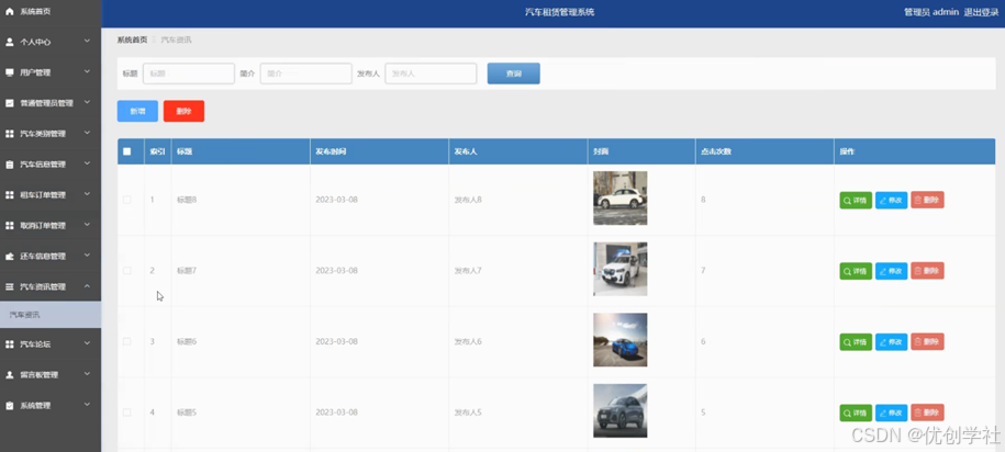 管理员点击汽车资讯管理。进入汽车资讯页面输入标题、简介和发布人进行查询,新增或删除汽车资讯列表。并根据需要对汽车资讯进行查看详情,修改或删除等操作。如图5-13所示: