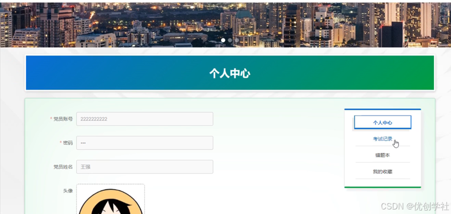 个人中心:在个人中心页面通过填写个人详细信息进行信息更新操作,还可以对考试管理、错题本、我的收藏进行详细操作;如图5-8所示: