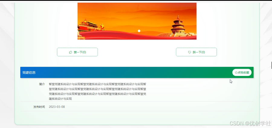 党建要闻:在党建要闻页面的输入栏中输入党建标题、简介进行查询,可以查看到党建要闻详细信息,并根据需要进行评论或收藏操作;党建要闻页面如图5-2所示: