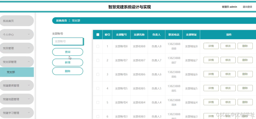 管理员点击党支部管理。在党支部页面输入支部账号进行查询、新增或删除党支部列表,并根据需要对党支部详情信息进行详情、修改或删除操作;如图5-12所示: