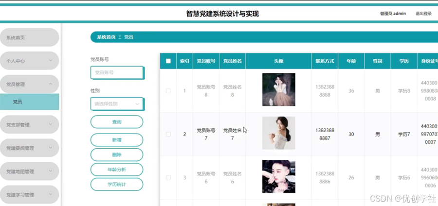 管理员点击党员管理。在党员页面输入党员账号和选择性别进查询、新增、删除、年龄分析或学历统计党员列表,并根据需要对党员详情信息进行详情操作;如图5-11所示: