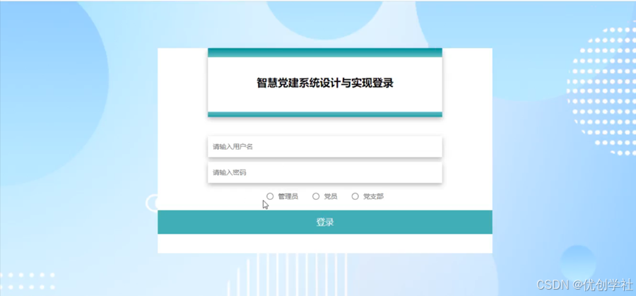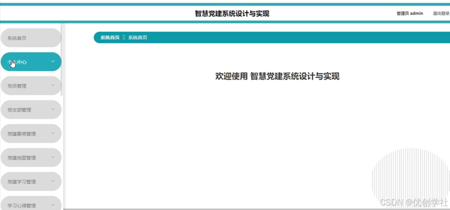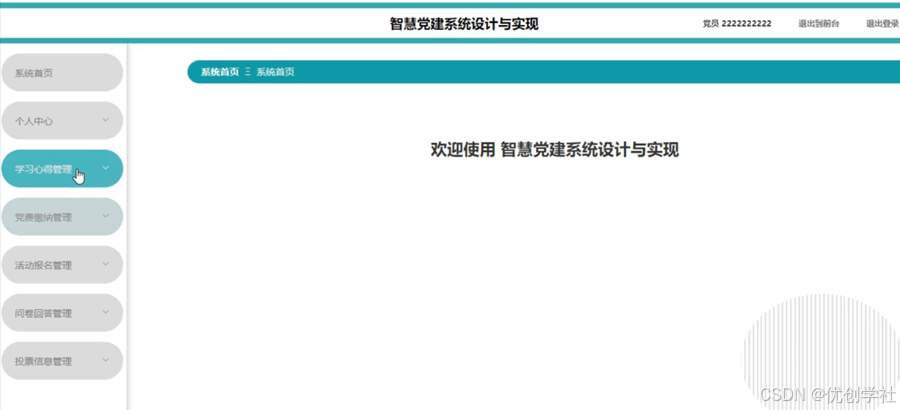 该智慧党建系统采用B/S架构,并采用Java语言以及Springboot框架进行开发。本系统主要设计并完成了用户登录管理过程、个人信息修改、对党员管理、党支部管理、党建要闻管理、党建地图管理、党建学习管理、学习心得管理、党费缴纳管理、党建活动管理、活动报名管理、问卷调查管理、问卷回答管理、民主投票管理、投票信息管理、试题管理、学习测试管理、系统管理、考试管理等功能进行管理。该系统操作简单,界面设计简单,不仅能基本满足目前智慧党建管理的日常管理工作,而且能有效降低人员成本和时间成本,为智慧党建管理工作提供方便。