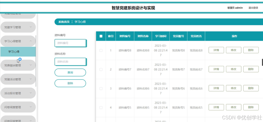 管理员点击学习心得管理。在学习心得页面输入资料编号、资料名称进行查询或删除学习心得列表,并根据需要对学习心得详情信息进行详情、修改或删除操作;如图5-15所示: