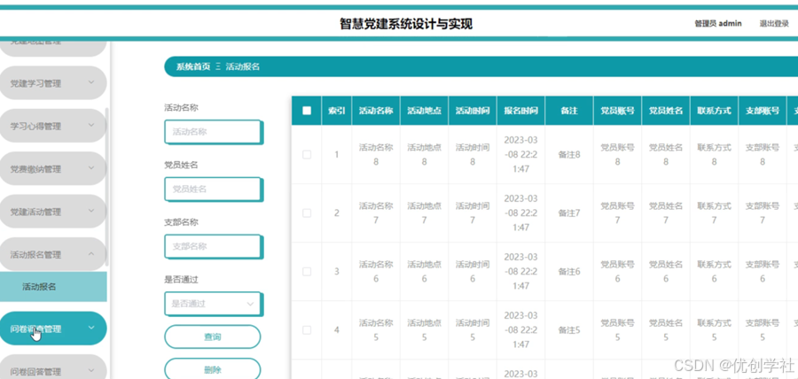 管理员点击活动报名管理。在活动报名页面输入活动名称、党员姓名、支部名称、是否通过进行查询或删除活动报名列表,并根据需要对活动报名详情信息进行详情操作;如图5-16所示: