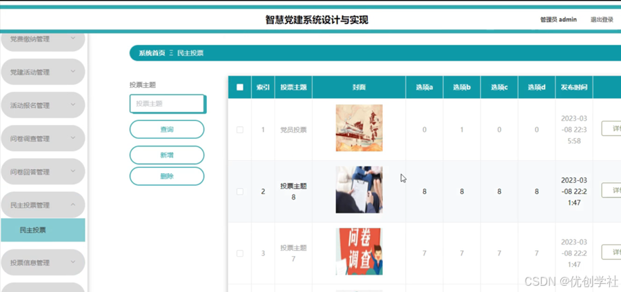 管理员点击民主投票管理。在民主投票页面输入投票主题进查询、新增或删除民主投票列表,并根据需要对民主投票详情信息进行详情、修改或删除操作;如图5-20所示: