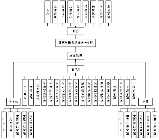 - 系统管理员主要对个人中心、党员管理、党支部管理、党建要闻管理、党建地图管理、党建学习管理、学习心得管理、党费缴纳管理、党建活动管理、活动报名管理、问卷调查管理、问卷回答管理、民主投票管理、投票信息管理、试题管理、学习测试管理、系统管理、考试管理等功能进行管理。