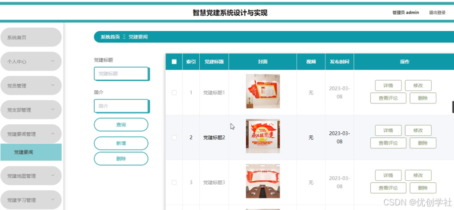 管理员点击党建要闻管理。在党建要闻页面输入党建标题、简介进行查询、新增或删除党建要闻列表,并根据需要对党建要闻详情信息进行详情、查看评论、修改或删除操作;如图5-13所示: