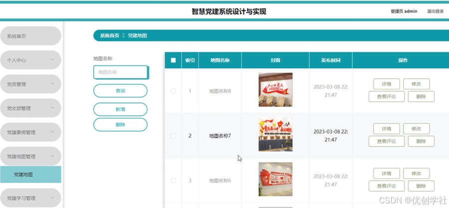 管理员点击党建地图管理。在党建地图页面输入地图名称进行查询、新增或删除党建地图列表,并根据需要对党建地图详情信息进行详情、查看评论、修改或删除操作;如图5-14所示: