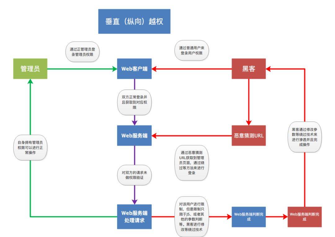 纵向越权,以低权限访问⾼权限。⽐较通俗的理解,低权限可以认做是⼀名普通⽤户去访问⼀名带有权限的⻚⾯或操作。例如,⼀个店铺的⽹站,⼀般由店⻓或管理员对⽹站进⾏管理和修改,⽽当需要店⻓权限的⻚⾯URL被获取了以后,普通店员若能够访问该⻚⾯,并成功进⾏⼀系列的操作,则可以判断为纵向越权了,例如普通店员修改了只有店⻓才可以进⾏的货品上架、价格修改、财务结算等操作。