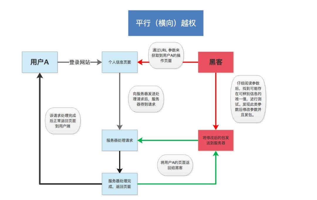 横向越权,以相同权限可相互访问。⽐较通俗的理解,例如QQ空间,同普通级别下,若⼀名普通⽤户A可以访问另外⼀名普通⽤户B的「隐藏空间」⻚⾯,甚⾄可以访问「动态发布」⻚⾯,则⽤户A可以以B的身份,发布⼀些不可描述的或者虚假的诈骗信息,则可以判断为横向越权了。