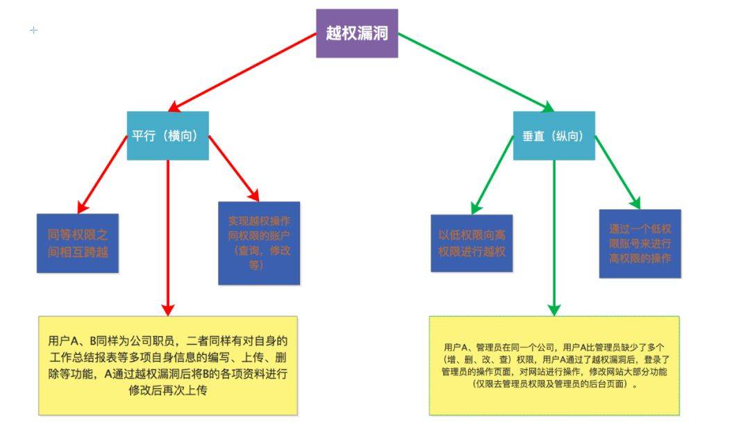 越权漏洞按照「权限」的区别,可以分为两⼤类型,即纵向越权(垂直越权)和横向越权(平⾏越权)。简单理解:纵向越权即以低权限可以访问⾼权限,横向越权以相同权限可以互相进⾏访问。
