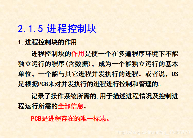 PCB 是进程实体的一部分,是操作系统中最重要的记录型数据结构。作用是使一个在多道程序环境下不能独立运行的程序,成为一个能独立运行的基本单位,成为能与其它进程并发执行的进程。OS是根据PCB对并发执行的进程进行控制和管理的。