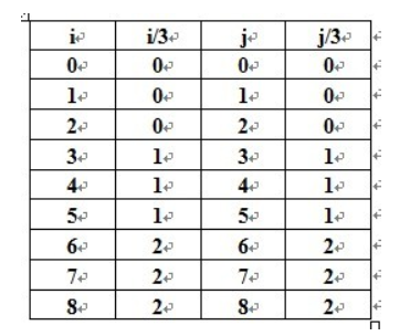 因此上面的关系式可变形为 3*((i-1)/3)+(j-1)/3+1=k