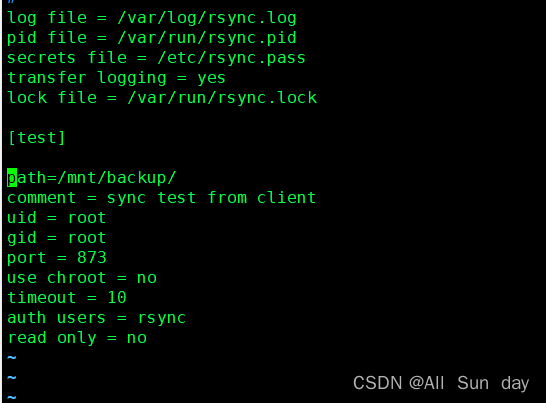到目前为止,rsync 就配置完成了,如果想实现双向同步,只要将 B 配置成服务端,A 配置成客户端,分别启对应的服务即可。