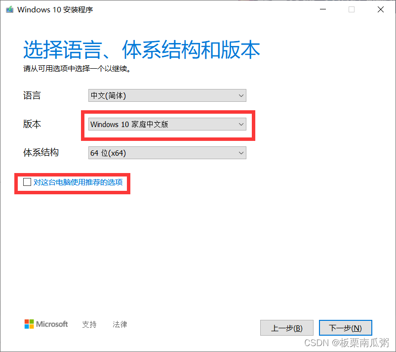 去掉“对这台电脑使用推荐的选项”的勾选,版本选择家庭中文版,点击下一步。