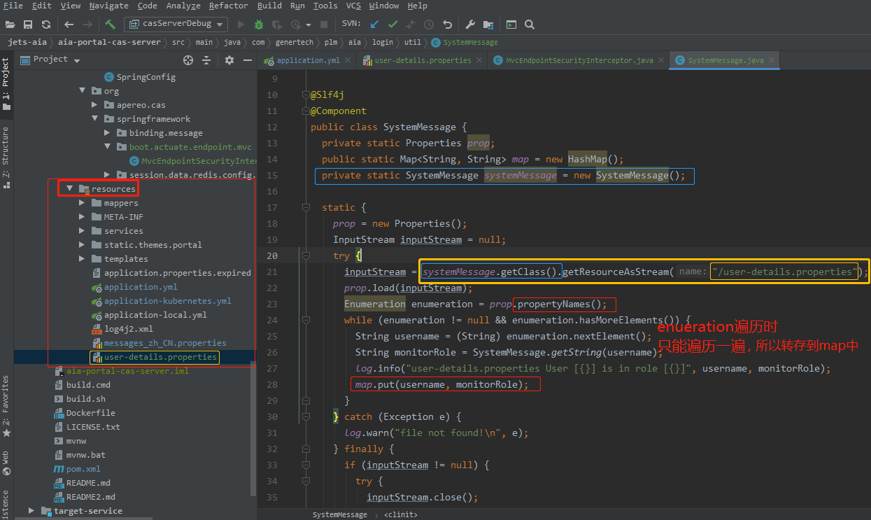 SystemMessage.java是一个Spring组件,用于从user-details.properties资源文件中加载和处理用户详细信息。它使用Properties类读取文件中的键值对,将用户名与角色关联,并提供获取不同数据类型(如字符串、整数、布尔值)的方法。如果文件未找到,日志会记录错误。