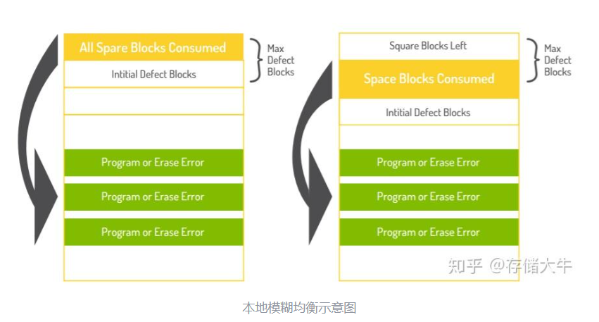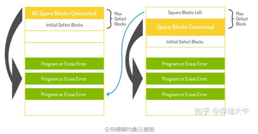 同样的情况,在全局磨损均衡下,盘为统一管理,可以使用右盘的备用block替换,避免了左盘进入写保护。