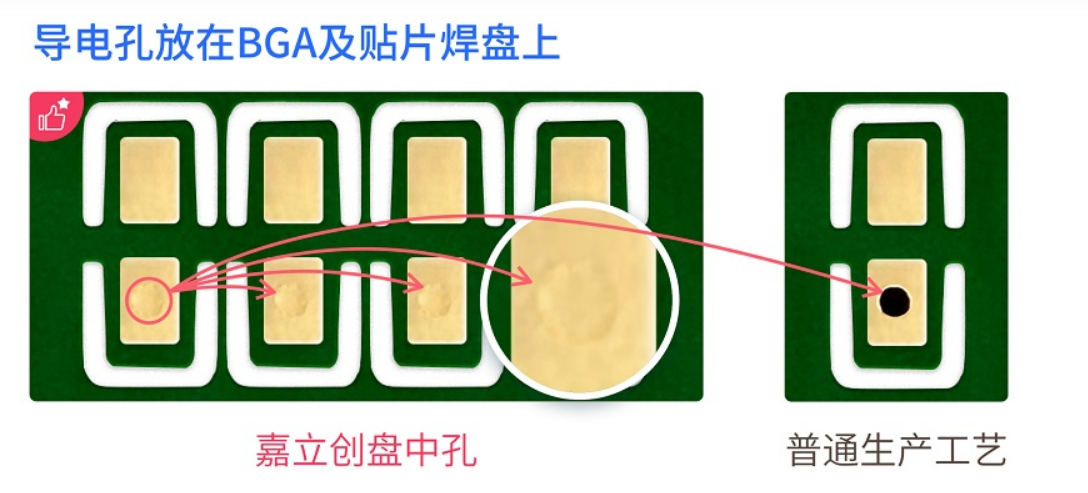 成本效益:值得一提的是,嘉立创对所有6层及以上的高多层板,免费提供“盘中孔工艺”,并标配“2u"沉金工艺”。
