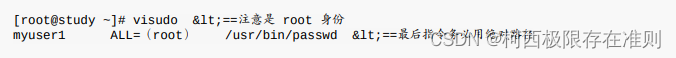 上面的设置值指的是“myuser1 可以切换成为 root 使用 passwd 这个指令”的意思。其中要注意的是: 指令字段必须要填写绝对路径才行!否则 visudo 会出现语法错误的状况发生! 此外,上面的设置是有问题的。