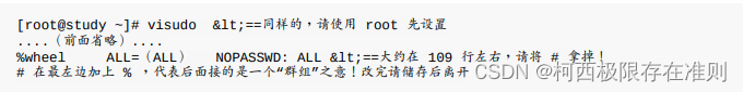 sudo 执行的重点是:“能否使用 sudo 必须要看 /etc/sudoers 的设置值, 而可使用sudo 者是通过输入使用者自己的密码来执行后续的指令串”。由于能否使用与 /etc/sudoers有关, 所以我们当然要去编辑 sudoers 文件。不过,因为该文件的内容是有一定的规范的,因此直接使用 vi 去编辑是不好的。 此时,我们得要通过 visudo 去修改这个文件。