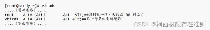那个 ALL 是特殊的关键字,代表任何身份、主机或指令的意思。所以,我想让 vbird1 可以进行任何身份的任何指令, 就如同上表特殊字体写的那样,其实就是复制上述默认值那一行,再将 root 改成 vbird1 即可。