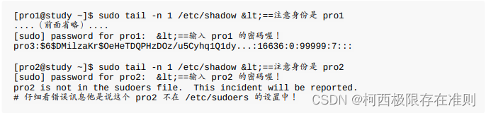 上面的设置值会造成“任何加入 wheel 这个群组的使用者,就能够使用 sudo 切换任何身份来操作任何指令”的意思。 你当然可以将 wheel 换成你自己想要的群组名。接下来,请分别切换身份成为 pro1 及 pro2 试看看 sudo 的运行。