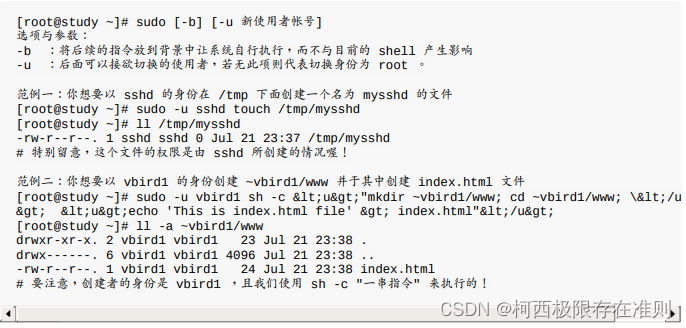 由于一开始系统默认仅有 root 可以执行 sudo ,因此下面的范例我们先以 root 的身份来执行,等到谈到 visudo 时,再以一般使用者来讨论其他 sudo 的用法吧! sudo 的语法如下: